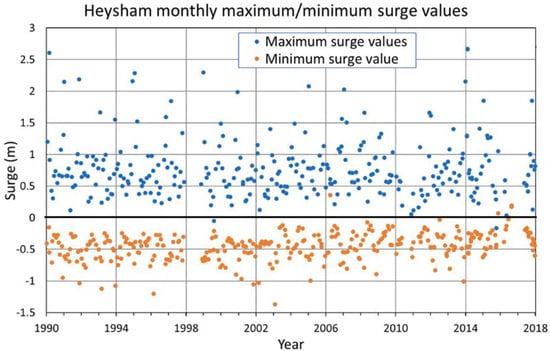 Storm surges are changes to sea level driven by meteorological variations in air pressure and wind; whilst not random, the chaotic occurrence of these events is only predictable a few days ahead. Surges can be positive or negative, but they have little effect on the annual power generation or income unless they persist over several tides. However, over the duration of the storm, they affect the sea level and, consequently, the timing and amount of electricity generated. S Baker [] investigated storm surges for Morecambe Bay using data from measured and forecast tide levels at Heysham between 1990 and 2018. Baker considered the difference to be due to storm surges. The distribution of peak events over 28 years is shown in Figure 7. This illustrates how much the tide can be raised or suppressed by sea surges driven by air pressure and the prevailing winds. A high surge coinciding with a very high spring tide maximises the threat. If the predictions for SLR come to fruition, then existing flood defences will be stretched and probably inadequate, requiring upgrading, or coastal areas will be flooded.