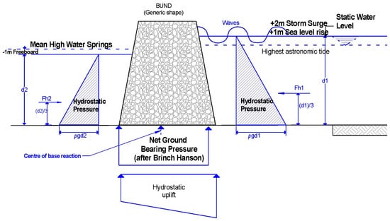 Uplift water pressure on the base of the bund is more nebulous. If the material below the base were very porous, then the hydrostatic pressures would govern, and there would be a flow of water from the sea to impoundment. This would not be permitted as it could undermine the foundation. If the foundation stratum is clay, or an impermeable barrier is installed, there will be little or no horizontal water flow. For the purposes of this paper, it is assumed that the distribution of uplift pressures is hydrostatic, as shown in Figure 8.