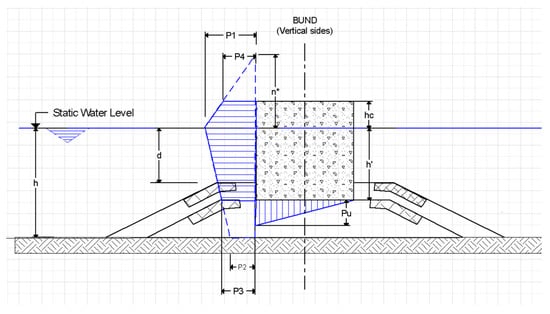 The uplift pressure (Pu) in Figure 9 assumes that the breakwater is installed on a rubble blanket above the seabed. For tidal range barrages, this will need to be an impermeable layer; the pore water pressure in the foundation material is likely to be the average sea level. The hydrostatic forces shown in Figure 8 are deemed to apply.