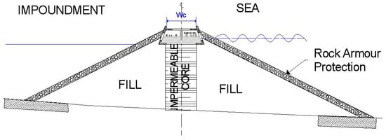 A stable embankment slope is normally between 1:2 and 1:3 batter; a figure of 1:2.5 will be used, which gives α = 68.2°. Wc is the width of the embankment crest, which is assumed to be a minimum of 12 m for a service road, verges, and parapets. Wc is significantly wider for a public road, and the overall level is raised to avoid wave overtopping. Sliding and overturning are not significant for an embankment. The limiting factor of safety is usually governed by slip circles. However, an embankment is included in the following analysis for comparison purposes (Figure 10).
