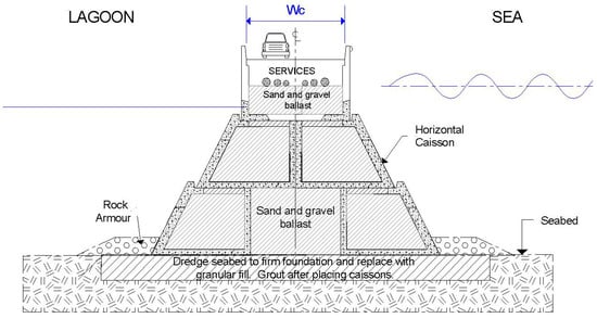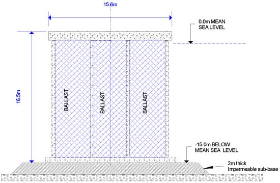 The overall height of the barrage from base to crest will vary along its length due to the depth of the seabed. A generic design for barrages is demonstrated with seabed depths of 10, 14, and 18 m below the Ordnance Datum (OD). Traditionally, barrages have been constructed as earth embankments with impermeable cores and rock or concrete armour protection. More recently, vertical cellular caissons have been used for breakwaters and jetties []. These are reinforced concrete cells cast vertically on jack-up rigs moored offshore or in deep-water docks. They are floated into position and then ballasted with sand or gravel to aid stability. Precast concrete overcomes most of the difficulties in constructing an embankment in a marine environment. Damage and delays can occur to partially complete embankments before the rock armour protection is in place. To date, vertical caissons have been built with constant width from top to bottom. The base width is chosen for stability against the water pressures. The width of the crest may be greater than is required for operational or stability reasons. The authors consider a form of open-top longitudinal caisson that could be floated into position and ballasted in the same way as the vertical caissons but in shallower water. This may reduce material quantities and costs. Typical cross-sections and cost estimates are given.