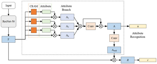 As shown in Figure 2. In the improved vehicle re-identification network architecture focusing on attribute information, the network model first extracts image feature information from the main network, generating a feature map F. Subsequently, the global feature F is fed into attribute branches based on attention modules, resulting in various attribute feature maps . These attribute feature maps are then combined using an attribute re-weighting module to produce a unified and comprehensive attribute feature map A, encompassing all attributes. The generated attribute feature map A undergoes global average pooling and fully connected layers to yield attribute feature vectors for attribute recognition. Simultaneously, useful attribute information is extracted through convolutional operations on the attribute feature map A. This information is subsequently integrated back into the global features, resulting in the final fusion feature map R. The spatial average pooling feature vector r of R is employed for the ultimate vehicle re-identification task.