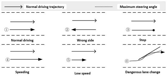Taking into consideration the characteristics of highway scenarios and vehicle motion, this study categorizes common highway vehicle motion behaviors into normal and abnormal behaviors. Normal behaviors encompass compliant driving actions such as straight-line driving and lane changing that adhere to road traffic safety regulations. Abnormal behaviors, on the other hand, encompass actions like driving in the opposite direction, speeding, moving at a slow pace, stopping, and making hazardous lane changes. A schematic diagram is illustrated in Figure 3 for reference.