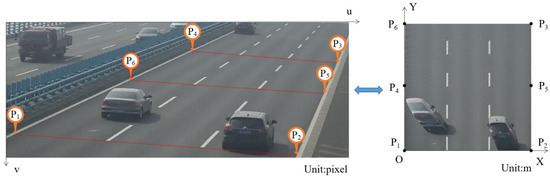 In Equation (5), if the pixel coordinates and the world coordinates of any point are known, can be determined as 1. Thus, there remain 11 unknowns in the projection transformation matrix M. In practical scenarios, the bridge deck can be approximated as a horizontal plane in the world coordinate system. The mapping reference points between the pixel coordinate system and the world coordinate system are illustrated in Figure 4.