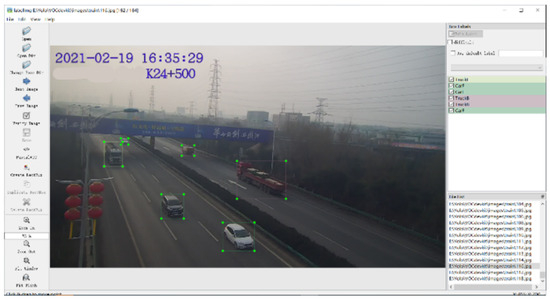 The dataset covers traffic surveillance videos captured by cameras with different pile numbers at different time periods, and image information is extracted by video processing technology. Then, the annotation tool LabelImg is used to label the rectangular boxes of the vehicles in the images of the dataset, and the information such as the type, location and size of the vehicles are annotated. An example of the processing of LabelImg as well as an example of the xml file generated by the final annotation is shown in Figure 8. In this way, a detailed and accurate highway vehicle detection dataset is obtained, which provides strong support for model training.