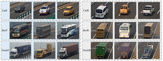 The categorization of the dataset is based on the differences in vehicle shapes and sizes, resulting in three main categories: car, bus, and truck. This categorization to a certain extent mitigates the recognition complexity of the model. Furthermore, considering the varying scales of vehicles captured from different monitoring perspectives, each category of vehicles is further subdivided into two directions: front and rear. The designation “F” is used for vehicles in the front direction, while “B” is used for vehicles in the rear direction. Consequently, the vehicles traveling within the research scene are classified into a total of six categories, as illustrated in Figure 9. In order to maintain the balance of data categories, the number of pictures in each category is 500.