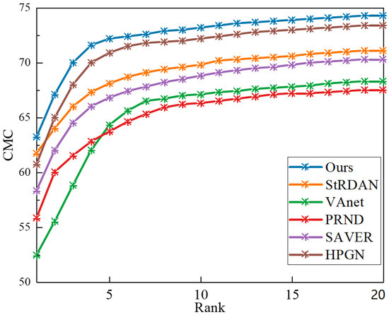 The comparative algorithms selected for evaluation included models that performed well on the VeRi-776 public dataset, namely: the StRDAN model utilizing attribute-based methods [32], the VAnet model based on viewpoints [33], the PRND model based on vehicle components [34], the SAVER model using GANs [35], and the HPGN model based on graph networks [36]. The Cumulative Matching Characteristic (CMC) curves of the experimental results are shown in Figure 12.