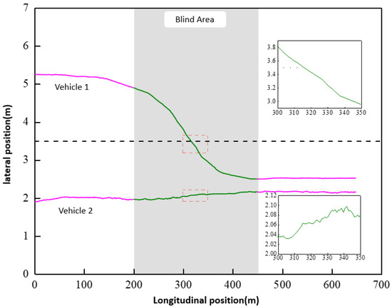 To further enhance vehicle tracking in the context of this study, the blind spot vehicle trajectory prediction model based on bidirectional LSTM was utilized for trajectory concatenation and prediction between adjacent cameras. This approach aimed to obtain complete vehicle travel trajectories under adjacent cameras. Using the Xi’an Ring Expressway as the application scenario, with a camera spacing of 450 m and an effective trajectory length of approximately 200 m per camera, the predicted trajectory length required for the blind spot was about 250 m, accounting for approximately 38.5% of the concatenated complete trajectory. Before concatenation, noise reduction was applied to the vehicle trajectory points by removing points with significant position data fluctuations. The resulting complete vehicle trajectory after concatenation is illustrated in Figure 13.