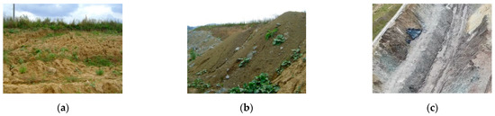Highways under construction near Žilina, Slovakia and in Przybędza, Poland. (a) Location No. 1: cut slide (soil CI), near Žilina, Slovakia; (b) Location No. 2: excavated soil, about 360 m from location No. 1 (soil CS1); (c) Location No. 3: cut slide (soil CS2), Przybędza, Poland [28].