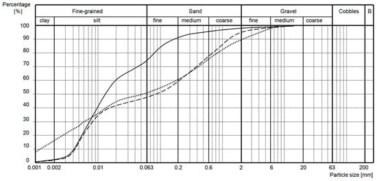 BS 1377: 1990. Part 2 [29] was applied to obtain soil particle size distribution, water content (w), liquid limit (wL), and plastic limit (wP), and British Standard BS 5930:2015 [30] was applied to classify the soils. The grain size distribution of the soils is presented in Figure 2 and the soil properties can be seen in Table 1.