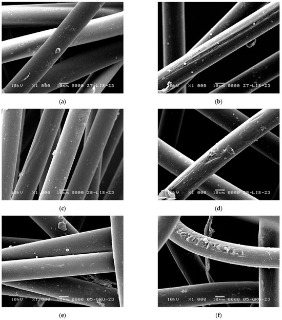 The SEM images of fibres applied in soil CS2 after shearing: (a) 0.5% fibres, normal stress of 50 kPa; (b) 0.5% fibres, normal stress of 300 kPa; (c) 1.0% fibres, normal stress of 50 kPa; (d) 1.0% fibres, normal stress of 300 kPa; (e) 1.5% fibres, normal stress of 50 kPa; (f) 1.5% fibres, normal stress of 300 kPa.