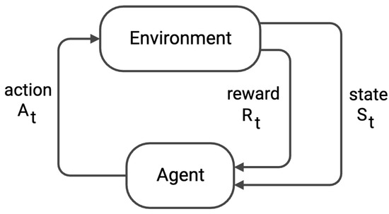 The interaction between the agent and the environment occurs at each discrete time step, t. As depicted in Figure 1, the agent receives an observation or state from the environment , through which it chooses an action from the set allowed by the environment. In return for this action, the agent receives a reward and a new state.