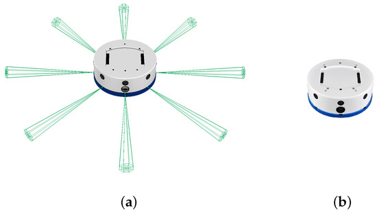 The action space of the environments is defined by the linear (V) and angular () velocities of the mobile robot, reflecting the fundamental kinematic model of a differential drive robot. This framework allows for precise control over the robot’s movements, as supported by the well-established kinematic equations cited in [45]. The linear velocity facilitates forward motion, while the angular velocity governs the rotation around the robot’s central axis. The control signals for both linear and angular velocities are normalized to ranges of 0 to 1 and to 1, respectively, ensuring compatibility with the simulation environment.
