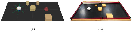 Visual comparison between the simulated (a) and the real environment (b), highlighting the consistency in layout and interactive elements.