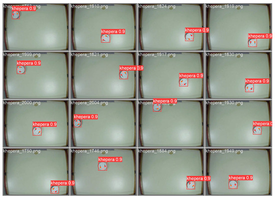 The robot’s position within the platform is tracked using a webcam to provide input for a YOLO v8 [47] model trained on a dataset of 2000 manually labeled images of the Khepera on the platform. This model performs pose estimation tasks for the robot. Upon detection within an image, YOLO provides a bounding box from which the robot’s (x, y) coordinates and three key points are extracted, as referenced in Figure 6. Through the application of trigonometric formulas, the relative positions of these points enable the calculation of the robot’s angular orientation with respect to its surroundings. A black rectangle indicating the robot’s front has been added to assist YOLO in determining the robot’s orientation.
