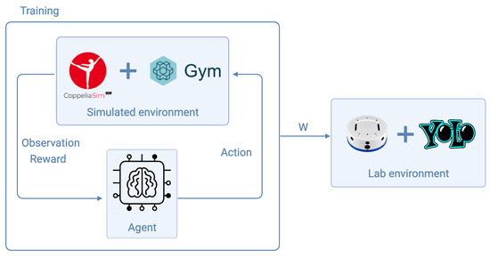The Sim2Real process ensures a seamless transition of control policies from the simulated environment to the physical platform. This approach involves training RL agents within the virtual CoppeliaSim environment, then transferring the learned weights to the real-world Khepera IV robot. By maintaining consistency in software and methodology across both platforms, the transition enables the effective application of sophisticated navigation and obstacle avoidance strategies developed in simulation (Figure 9).