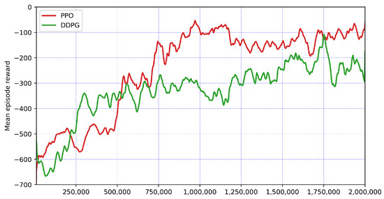 Two distinct RL models, PPO and DDPG, were trained over a span of 2 million timesteps, translating to a total training duration of approximately 27.3 h for PPO and 31.3 h for DDPG, respectively. For the DDPG agent, training was conducted using default parameters from the Stable Baselines3 library, with a learning rate of 0.001, buffer size of 1,000,000, learning initiation at the 100th iteration, batch size of 256, set to 0.005, and a value of 0.99. These parameters were optimized to balance exploration and exploitation, ensuring stable and efficient learning. Similarly, the PPO agent was configured with a learning rate of 0.0003, 2048 steps per update, batch size of 64, and training across 10 epochs. Additional settings included a of 0.99, Generalized Advantage Estimation (GAE) of 0.95, and a policy clipping range of 0.2, also tailored to foster both stability and efficiency in learning. The performance of each agent is graphically depicted in Figure 10, where the training graph illustrates the mean episode reward over the course of the training period. The primary objective of the training in simulation is to facilitate transfer learning (Sim2Real) for seamless deployment and adaptation in the real-world platform.