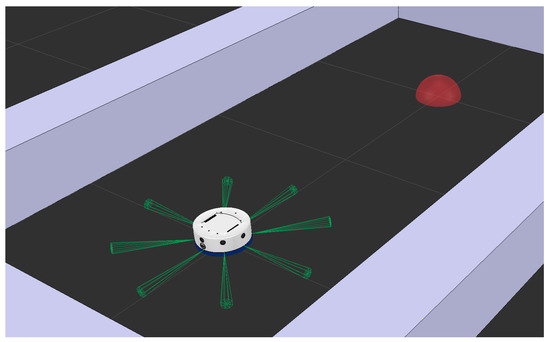 The observation space of the environments, which provides the current state to the agent, consists of a list that includes the distance between the robot and the target (d), the angular difference between the robot’s orientation and the target position (), ranging from to , and a set of normalized measurements (between 0 and 1) from the robot’s eight infrared sensors (as illustrated in Figure 4). These values are either derived from the simulation or calculated through requests made via the simulation API. In actual environments, the absolute position and orientation of the robot are determined through a tracking platform equipped with a camera.