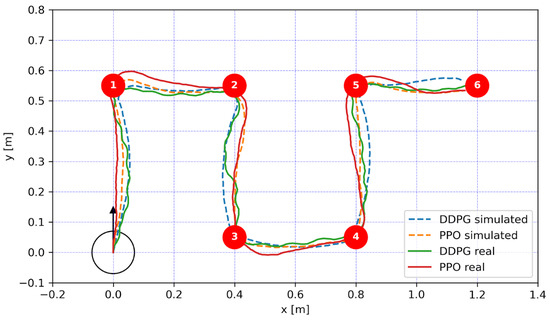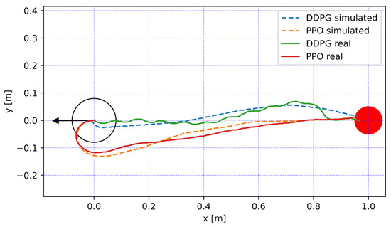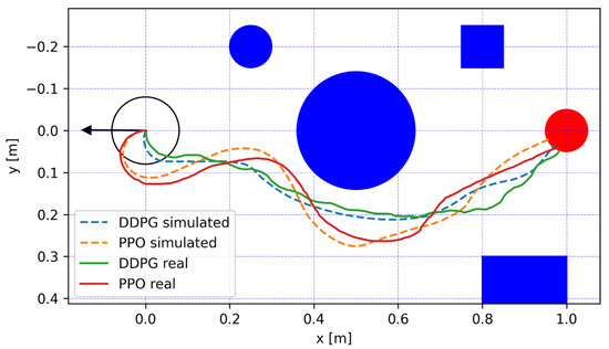 Figure 12 illustrates the trajectory paths traversed by the DDPG and PPO agents in simulated and actual environments. The paths showcase the strategic movements from the starting point at the origin (0,0), marked by the robot, to the target at (1,0), highlighted by a red circle. The robot’s initial position, oriented away from the target, required a calculated turn, as evidenced by the early curvature of the paths, before proceeding directly towards the endpoint. This maneuvering efficiency is crucial for a beach-cleaning robot that needs to navigate to various locations on a beach while avoiding static and dynamic obstacles.