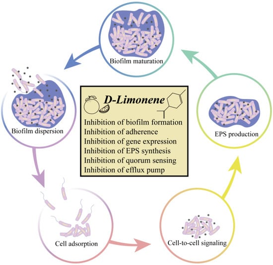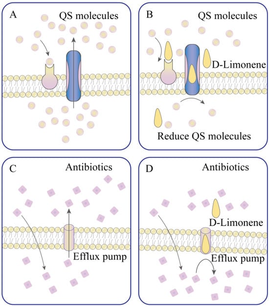 The quorum sensing and efflux pump systems are important for biofilm formation and virulence expression [120,121]. The QS system is a process of microbial communication through small, diffuse chemical signaling molecules (i.e., QS molecules), which can be involved in the coordination of certain behaviors, such as biofilm formation, virulence, and antibiotic resistance [122,123], and the EP system is responsible for secreting toxins, proteins, and polysaccharides formed by the cell, as well as the efflux of toxic compounds found in the microbial context, such as antibiotics [124]; D-limonene has an inhibitory effect on both systems (Figure 3).