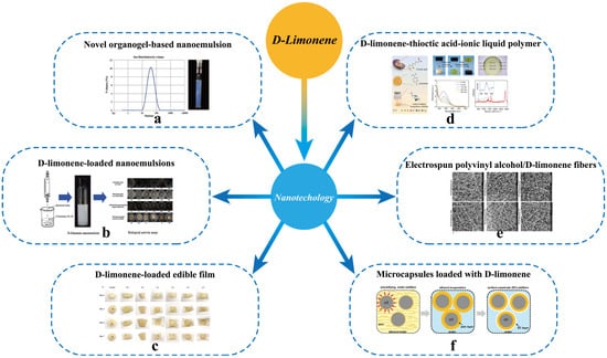 The application of D-limonene: (a) D-limonene using a novel organogel-based nanoemulsion (Reprinted from Zahi et al. [187]). (b) D-limonene-loaded nanoemulsions (Reprinted from Feng et al. [188]). (c) D-limonene-loaded edible film (Reprinted from Luo et al. [189]). (d) D-limonene-thioctic acid-ionic liquid polymer (Reprinted from Sun et al. [190]). (e) Electrospun polyvinyl alcohol/D-limonene fibers (Reprinted from Lan et al. [191]). (f) Microcapsules loaded with D-limonene (Reprinted from Chen et al. [192]).