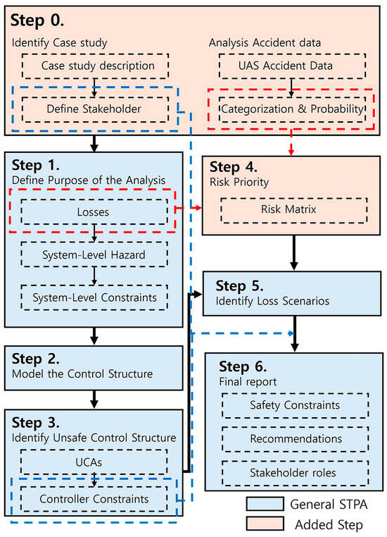 The proposed framework is based on STAMP/STPA. As shown in Figure 2, STAMP/STPA specifies the guidelines and outcomes that need to be achieved, but it does not specify the tools and models to be used in the detailed steps [40]. This flexibility allows for highly adaptable application, enabling the development of the proposed framework to achieve the research objectives.