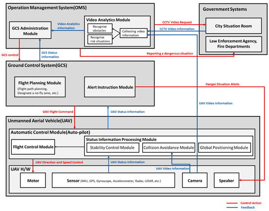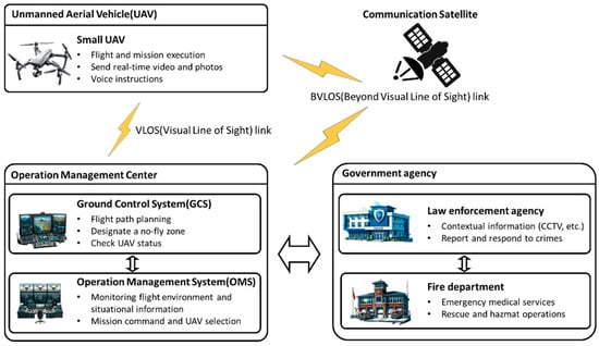 The primary purpose of this system is to monitor vulnerable areas within urban environments and patrol CCTV blind spots. The Operational Management Center (OMC) plays a central role in this system, as described in Figure 3. Within the OMC, the Operational Management System (OMS) monitors weather information and current situations in real time and handles communication with government agencies, including law enforcement agencies and fire departments. Based on the collected information, it issues mission directives to the Ground Control Station (GCS). The GCS, in turn, sets flight paths considering no-fly zones and undertakes control related to the UAVs. Following the GCS instructions, UAVs perform flights, collecting and transmitting information. In cases of crimes or specific situations where deterrence is necessary, warning broadcasts are conducted through speakers to address the issue.