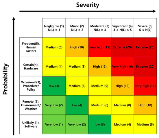 A risk matrix is a tool used to assess and prioritize risks based on their likelihood and potential consequences. It provides a visual representation of risk levels, allowing decision-makers to focus on the most critical risks. The matrix consists of a grid with likelihood on one axis and severity on the other. Each cell in the matrix represents a risk level determined by the combination of likelihood and severity ratings. The risk matrix enables a semi-quantitative prioritization of risks, helping organizations allocate resources effectively to mitigate the most significant threats. Risk matrices are frequently used in the aviation industry, including EASA and FAA, and the risk is calculated as “Risk = probability × severity”, which is then converted into a matrix to determine the risk level. However, STPA does not generate a probability number related to the hazard. In fact, it discourages the use of probability in the analysis because of the uncertainty in predictions and false beliefs in complex systems [21,22]. Therefore, in this framework, the risk matrix is used to derive cost priorities for risk mitigation [41]. Moreover, to avoid relying on probability predictions, a statistical approach based on UAS accident data was employed.