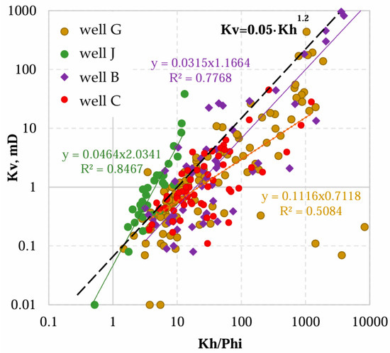 However, we have found that the power coefficient of 0.5 does not match the correlation line when plotting Kv vs. (Kh/Phi)0.5. The datasets of individual wells required a substantially higher slope than 0.5. To clarify the power coefficient, Kv was plotted vs. Kh/Phi for four wells in Figure 1. The highest slope of 2 was required for Well J, which is located outside of the considered area. The lowest slope of 0.7 was obtained for Well C. The analyses on Wells B and G indicate that most of the data have a slope of 1.2.