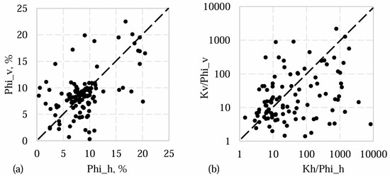 Despite the absence of fissures in Well G, certain intervals within the very tight formation exhibited Kh up to 200 mD. However, irrespective of the high values of the permeabilities, ranging up to 10,000 mD, the data of Well B closely followed a 1/1 line. The data deviating above the 1/1 line indicate secondary fabrics with increased Kv, while the data below indicate a depositional pore structure. In [21], it can also be seen that a group of data followed a 1/1 line, with other data below it indicating a higher Kh.