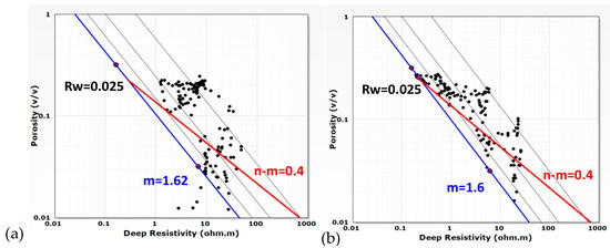 Pickett plots for (a) Well G; (b) Well E. Rw—resistivity of formation water; m—cementation factor; n—saturation exponent.