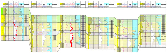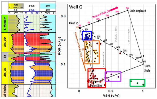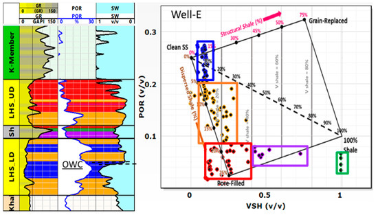 Shale volume (Vsh) and clay type can significantly affect the values of water saturation derived from resistivity logs. To account for shaliness in the calculations of Sw, numerous water saturation models have been derived, which can be found elsewhere [25,27]. The Juhasz plot was used to evaluate the clay type distribution, as shown for Wells G and E in Figure 5 and Figure 6. The shale lines were adjusted to make sure that the shale in the middle of LHS was indicated as shale. Along the depth, clay types were distributed differently, as indicated by the different colors. In the tight oil section, the clay is pore-filling, with Vsh between 20 and 25%. In the cleanest part of the sandstone with the highest porosity, the dispersed clay is below 7%. In other parts also with high porosity, the Vsh of dispersed clay varies between 7 and 15%.
