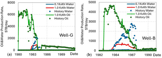 Comparison of observed and simulated oil production rate (OPR) and water (WPR) productions designated as historical and simulated values using a Kv/Kh of 1 and 0.1: (a) Well G, (b) Well B. The Kv/Kh = 1 scenario better matched the WPR than the 0.1 scenario, indicating vertical water inflow.