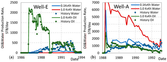 Observed and simulated oil production rate (OPR) and water production rate (WPR) designated as historical and simulated values using a Kv/Kh of 1 and 0.1: (a) Well E, (b) Well A. The Kv/Kh = 0.1 scenario better matches the WPR, indicating lateral water inflow.