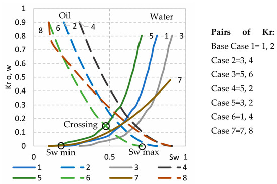 Wettability can significantly influence oil recovery. The position of relative permeability curves on the plot of water saturation indicates wettability: lower Sw—oil-wet; higher Sw—water-wet. Reliable relative permeability data to be used in the simulation were not available for the LHS reservoir. For the simulations of OPR and WPR shown in Figure 9 and Figure 10, a pair of relative permeability curves called Case 1 (Base case) were used with Kv/Kh = 0.1 (Figure 11). To test the sensitivity of the simulation results to the changes in relative permeabilities, six additional pairs of curves were generated. The curves were shifted relative to the curves of base Case 1, as follows: Case 2—shifting both curves to the right; Case 3—shifting both curves to the left; Case 4—shifting Krw only to the left; Case 5—shifting Krw only to the right; Case 6—shifting Kro only to the right; and Case 7—modifying the curvature by changing the curvature and reducing the Krw max (Figure 11). Shifting to the left indicates more water-wet and shifting to the right indicates more oil-wet contact between the rock and fluid. In the result, the following pairs of Kr with the specific crossing points were used to build the cases: Case 1 with Sw = 0.58 for (1, 2); Case 2 with Sw = 0.68 for (3, 4); Case 3 with Sw = 0.48 for (5, 6); Case 4 with Sw = 0.51 for (5, 2); Case 5 with Sw = 0.63 for (3, 2); Case 6 with Sw = 0.61 for (1, 4); and Case 7 with Sw = 0.6 for (7, 8). Crossing points and intervals of Sw are shown in Table 2. Thus, of all these cases, Case 3 indicates the most oil-wet and Case 2 indicates the most water-wet conditions, while Case 7 covers the widest Sw range.