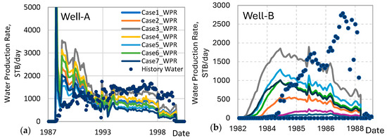 Actual (historical data) and simulated water production using different pairs of relative permeability curves that are plotted for different cases as shown in Figure 11: (a) Well-A, (b) Well-B.