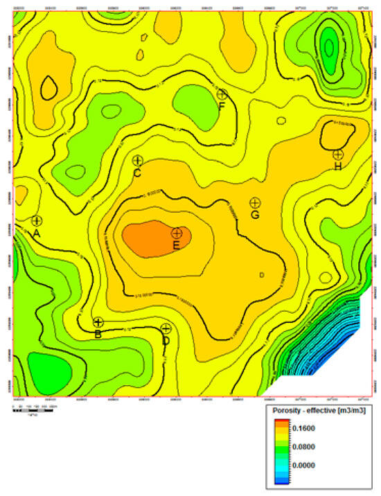 The highest porosity is related to the dome in the vicinity of Well E. Wells G and H also fall into the area with a high porosity of above 16% (Figure 13). Other wells with lower porosity in LHS surrounded this dome.