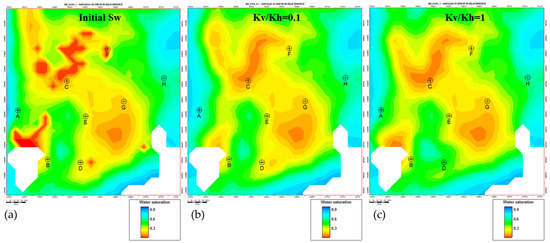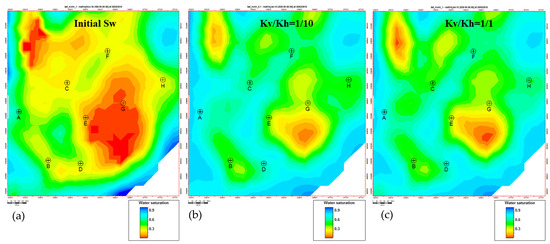 Petrophysical models of water saturation of porous LHS-LD reservoir: before the start of production (a) and at the end of production with (b) Kv/Kh = 0.1 and (c) Kv/Kh = 1. Red, orange, and yellow colors indicate the areas of remaining oil.