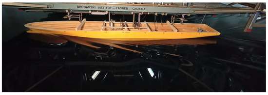 The ship model during the self-propulsion test at the model speed corresponding to 22 knots in full scale is shown in Figure 3. The obtained experimental results were extrapolated based on the ITTC 1957 Performance Prediction Method using the correlation allowance equal to −0.35∙10−3. The required engine power at each speed was calculated based on the extrapolated value of the delivered power and an increase of 15% to account for the sea margin, 2% to account for the mechanical efficiency of transmission between engine and propeller, and 10% for engine margin.