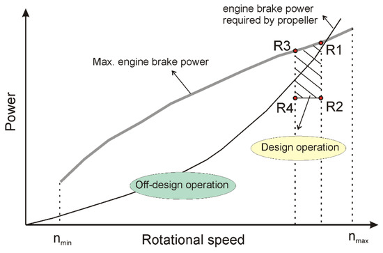 The engine power required by the propeller is also shown in Figure 8, Figure 9 and Figure 10. Since the transitional times of the propeller usually last for short periods while changing rotational speed, the engine operating points are positioned on the propeller curve. In other words, the equilibrium state between the engine and propeller is assumed.