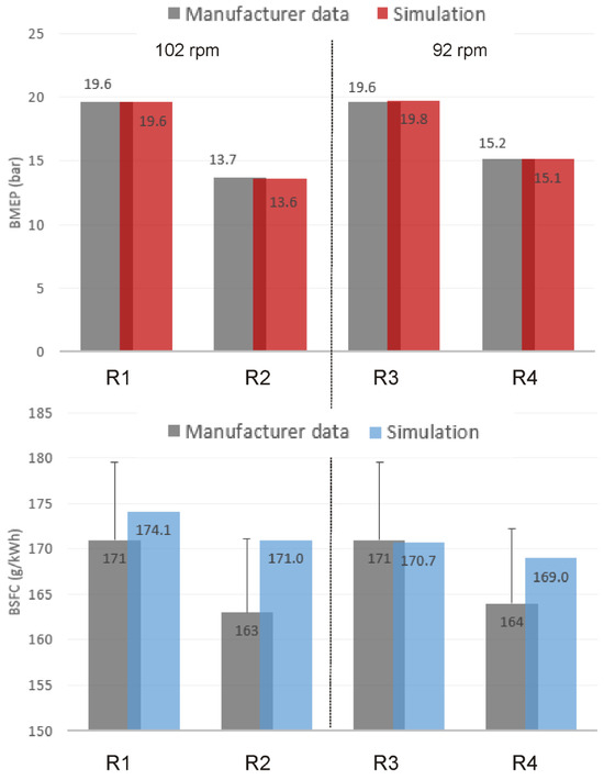 The validation of the simulation model was performed by comparing the simulation results with engine performance data declared by the engine manufacturer. Figure 6 shows the comparison of BMEP and BSFC at four operating points (R1—full load at 102 rpm, R2—70% of load at 102 rpm, R3—full load at 92 rpm, and R4—load equal to R2 at 92 rpm).