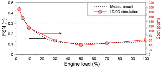 The simulation results of soot emission matched the reference measured data of FSN well. As the engine load decreases, more soot is emitted because the lower boosting pressure is applied, reducing the quality of cylinder scavenging and turbulence quantities that are responsible for primary and secondary fuel break-up and the fuel/air mixing process.