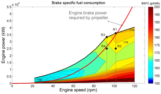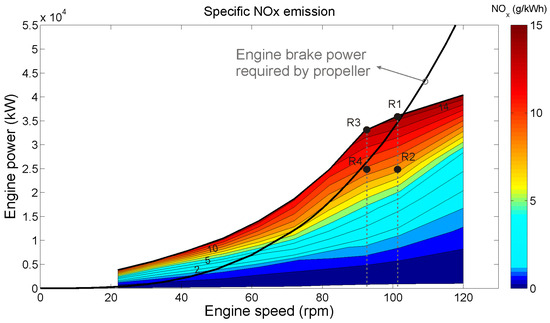 It is assumed that transition periods of ship acceleration and deceleration are very short compared to the total travel time, which means that instantaneous engine brake power is equal to the engine brake power required by the propeller. In other words, the instantaneous engine operating point lies on the propeller curve shown in Figure 4. The required power, ship speed, specific fuel consumption, and emissions can be evaluated for an arbitrary engine speed using linear interpolation.