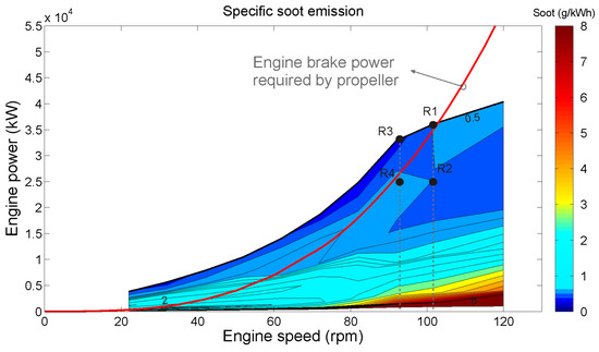 Considering the engine data declared by the manufacturer, the BMEP that is achieved at the R1 and R3 operating points is fully independent of the number of cylinders. This means that the brake engine power is proportional to the number of cylinders and the maximum engine power for the engine with seven and eight cylinders can be easily computed so that the brake power of the six-cylinder engine variant is multiplied by 7/6 and 8/6, respectively. Topographic diagrams of fuel consumption, NOX and soot for seven- and eight-cylinder engine variants are generated so that the engine power at each operating point is multiplied by 7/6 and 8/6, respectively, while the property of fuel consumption and emissions expressed as specific values remain unchanged. The increase in maximum engine brake power increases the achievable maximum sailing speed. With a seven-cylinder engine variant, the maximum engine speed is equal to 110 rpm (speed of 25 knots), while the maximum engine speed of 116 rpm (speed of 26 knots) can be achieved with the eight-cylinder engine variant. The engine performance for operating points that are positioned at the propeller curve is calculated using linear interpolation.