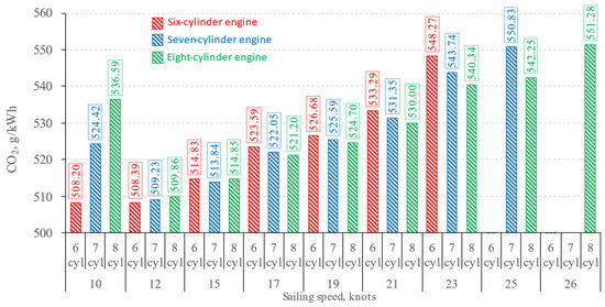 The comparison of CO2 emissions for different engine variants at different sailing speeds.