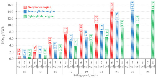 The comparison of NOx emissions for engine variants at different sailing speeds.