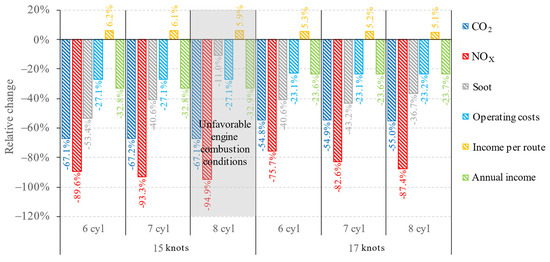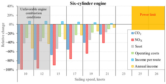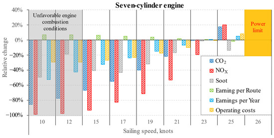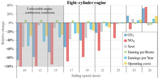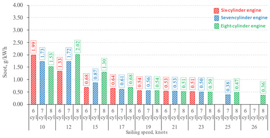 The confirmation for such criteria is that the relative increase in specific soot emissions of 95.5% in the case of the six-cylinder engine variant is observed in the sailing speed reduction from 15 to 12 knots. For the seven-cylinder engine variant, the relative increase in specific soot emission of 97.7% is also observed in the sailing speed reduction from 15 to 12 knots. For the eight-cylinder engine variant, the relative increase in specific soot emissions of 91.2% is observed in the sailing speed reduction from 17 to 15 knots.
