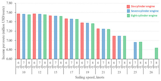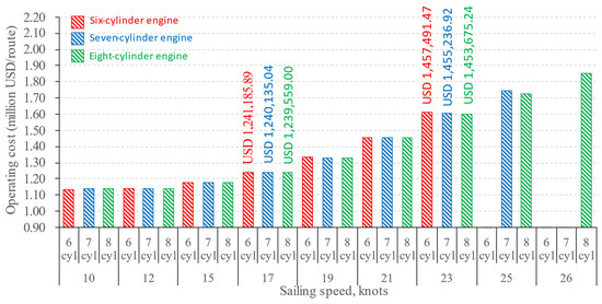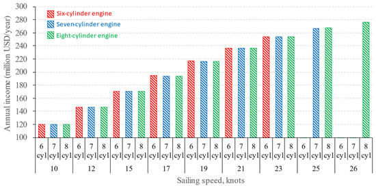 In addition to emissions, slow steaming also affects the operating costs. During slow steaming, the fuel costs are reduced and, due to longer sailing time, the crew costs are increased. Changes in operating costs consequently change the ship’s income. The effects of sailing speed on operating costs, income per route and annual income are shown in Figure 14, Figure 15 and Figure 16. The costs and income were analyzed for the Trans-Pacific route (4503 nm). According to [36], the average contract freight rate for a 40-foot container or 40-foot equivalent unit (FEU) on the route from Asia to North America is 2580 USD/FEU. The ship is designed to carry 6750 TEU, which is equal to 3375 FEU and represents a cargo value of USD 8,707,500.00. The reference ship marine engine is the six-cylinder engine variant. As each new cylinder section of the Wartsila Sulzer RTA-96C engine series adds additional weight, the seven-cylinder engine variant has 130 tons more weight [37], which is the weight of 5 TEU and the carrying capacity for the seven-cylinder engine variant is 6745 TEU. The eight-cylinder engine variant has 300 tons more than the six-cylinder engine variant, which means that the carrying capacity of the eight-cylinder engine variant is 6738 TEU. That represents a decrease in cargo value of 0.07% and 0.18% for the ship configuration with the seven-cylinder and eight-cylinder engine variants, respectively. In general, the operating costs are comprise fuel costs, port charges, crew costs, repair and maintenance costs, insurance charges, parts and lubes costs, and administration costs [38]. According to the diagram which depicts the distribution of operating costs of Panamax, Post Panamax and Post Panamax plus containerships sourced from Drewry Shipping Consultants Ltd., London, United Kingdom in [38], in the case of a Post Panamax containership, the fuel contributes to 49% of operating costs, port charges to 23%, insurance charges to 8%, repair and maintenance costs to 8%, stores and lubes to 2%, manning or crew costs to 8%, and administration to 2%. The fuel costs and overall operating costs were calculated based on the global 20 ports’ average price of Very Low Sulfur Fuel Oil (VLSFO), also known as IMO2020 grade bunkers, which is currently 658 USD/ton [39]. The operating costs for all engine configurations are calculated based on the assumption that 49% of operating costs are fuel costs and all other operating costs are calculated according to their above-mentioned contribution to overall operating costs. The reference operating costs are calculated for the sailing speed of 23 knots at which the ship can sail the selected route in 195.5 h. Insurance charges, repair and maintenance costs, stores and lubes costs and administrative costs are assumed independent on sailing time and frequency and these costs are set to constant values. Crew costs are calculated by multiplying the required sailing time and the crew costs per hour.