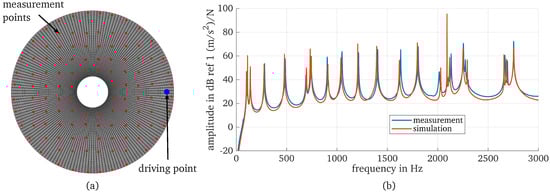 Figure 4b shows the experimentally and numerically obtained transfer functions in terms of accelerance, averaged over the 116 evaluation points as shown in Figure 4a. The transfer functions indicate a good agreement between measurement and simulation. To parameterize the model, a Young’s modulus of E = 205 , a density = 7850 and a Poisson’s ratio of = 0.3 were chosen. Since the clamping of the disk in the experiment with a flange of a diameter of 61 is not ideal, the effective clamping diameter is updated to fit the measurement data. A good correlation is found for a diameter of 58.5 . Since the circular disk is made from steel, damping is omitted in the simulation. The width of the peaks in the simulated and measured data matches well. This confirms the assumption of the omitted damping in the simulation.