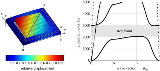 By applying the Bloch theorem [], the stop band behavior of an infinitely periodic VAMM can be predicted by calculating the dispersion curve of a single unit cell. Figure 6 (right) shows the dispersion curve of the unit cell with parameters a = 24 , b = 16 , c = 4.5 and d = 1 , and a thickness t = 2 . Figure 6 (left) shows the resonator in its first eigenmode and the Brillouin contour on which the dispersion curve is calculated. The parameters have been chosen in accordance with [].